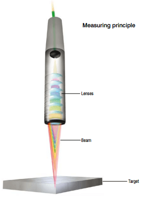 Polychromatic light (white light), starting from the light source in the controller, is transmitted to the sensor via an optical fibre. The lenses are arranged so that the light in the longitudinal direction of the optical axis is broken down by controlled chromatic aberration into monochromatic wavelengths. A lens focuses the light onto the target surface. Depending on the distance, there is a particular spectral colour (wavelength) in focus. In the sensor system, the wavelength of light exactly focused on the target is used for the measurement. The light reflected from this point is imaged by an optical arrangement onto a light sensitive sensor element, where the associated spectral colour is detected and evaluated. A defined distance point is assigned to each wavelength by factory calibration.