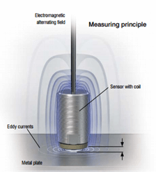 According to Faraday’s Law of induction, if an electrically-conducting object is present in this magnetic field, eddy currents are produced in it. According to the Lenz Rule, the field of these eddy currents is opposed to the field of the coil, which causes a change in the coil impedance. This change in impedance can be outputted as an absolute distance.