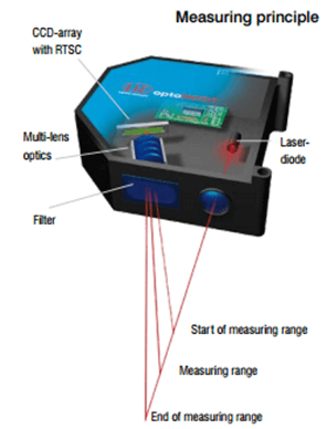Laser triangulation emits a laser beam which is aimed at the target. The light spot reflected from the target is imaged via a lens either on a CCD/CMOS array or on a PSD element. The intensity of the reflected beam depends on the surface of the material. The distance from the object to the sensor is calculated from the position of the light spot on the receiver element. The data is evaluated in the internal controller and output via various interfaces.
