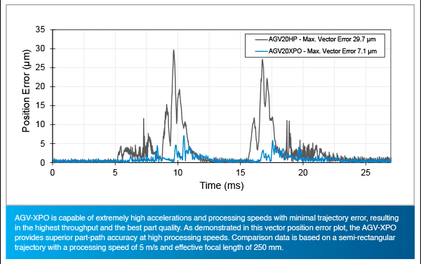 Our AGV-XPO scan heads are engineered from the ground up to deliver exceptionally high speeds and accelerations while simultaneously providing outstanding part-path accuracy. Key to this capability is a novel motor design, featuring an ultra-stiff, low-inertia rotor paired with a high-efficiency stator, resulting in increased bandwidth and reduced tracking errors when compared to more traditional galvo motor designs. Plus, specially optimized mirrors and mirror mounts further help to improve dynamic performance by increasing the torsional stiffness and reducing the rotational inertia.