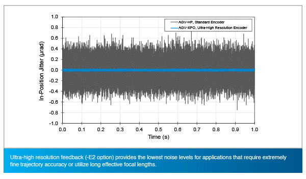 A high-resolution feedback device is paramount to achieving dynamic accuracy at high speeds. AGV-XPO is available in two feedback configurations to suit a diverse range of application requirements. For applications that demand the highest levels of acceleration and have short-to-medium effective focal lengths, a high-resolution position encoder with digitally interpolated output signals and a low-inertia scale (-E1 option) is preferred. For high-dynamic applications that require the finest part-path accuracy and/or utilize long effective focal lengths, an ultra high-resolution encoder with a feedback resolution finer than 0.0002 µrad (-E2 option) is available.