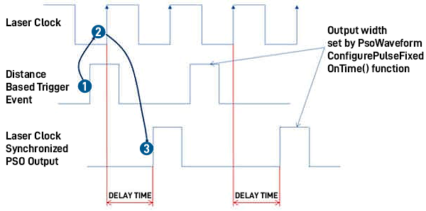 Figure 1 shows the timing of the PSO output pulse relative to the laser clock along with the effect of the DelayTime setting.