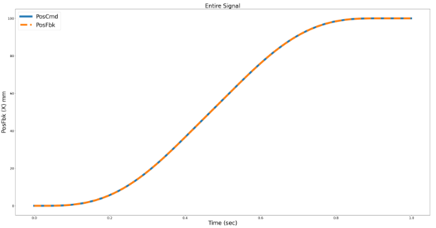 For this script, the following plot (figure 2) is collected. Because this command was run on a virtual (not real) axis of motion, the position feedback (PosFbk) matches the position command (PosCmd) perfectly.