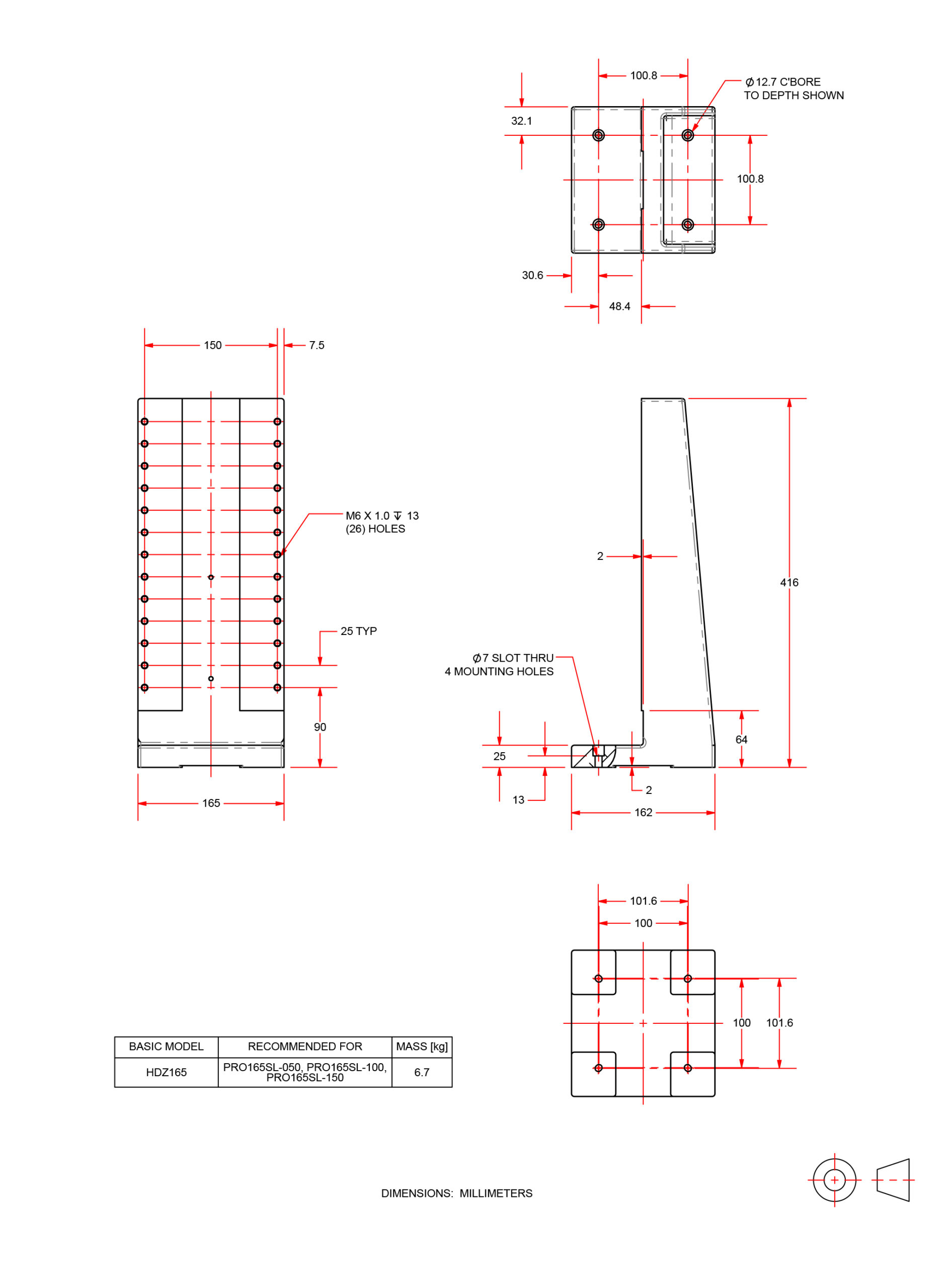 | HDZ165 | Right angle L-bracket for PRO165SL/SLE-050, PRO165SL/SLE-100, and PRO165SL/SLE-150 only. |