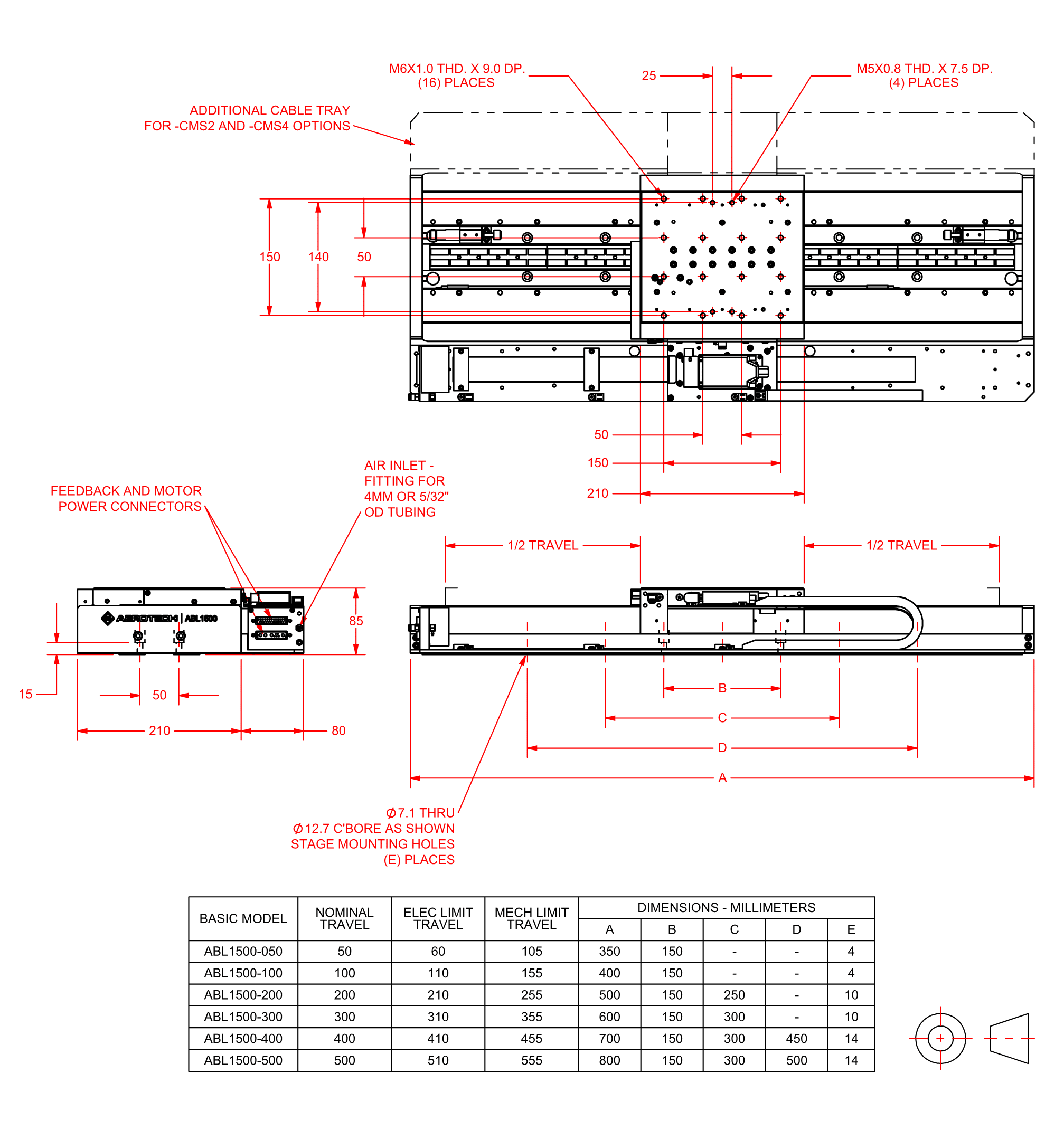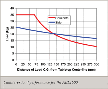 The ABL1500 incorporates an air-on-air preload on both the vertical and horizontal surfaces. The opposing thin-film pressure maintains the bearing nominal gap tolerance. This design, in addition to the large air bearing surface that distributes the load over a large surface area, results in a stage with outstanding stiffness that is ideal for heavy or offset loading.